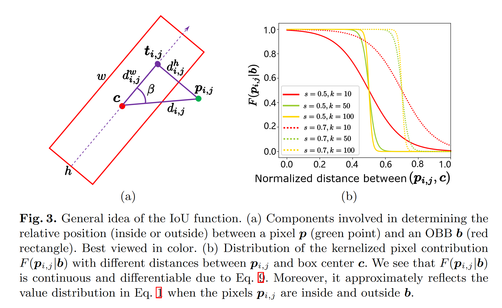 PIoU Loss 的想法比较简单,就是统计两个任意旋转框之间的共有像素个数来近似 IoU。文章有一个很大的问题就是 baseline 太低了,文章最终报的性能才 60 出头,但是在这个领域做 DOTA 数据集的 baseline 不给 65 以上都不好意思了,所以有理由质疑这个方法是否有效了。