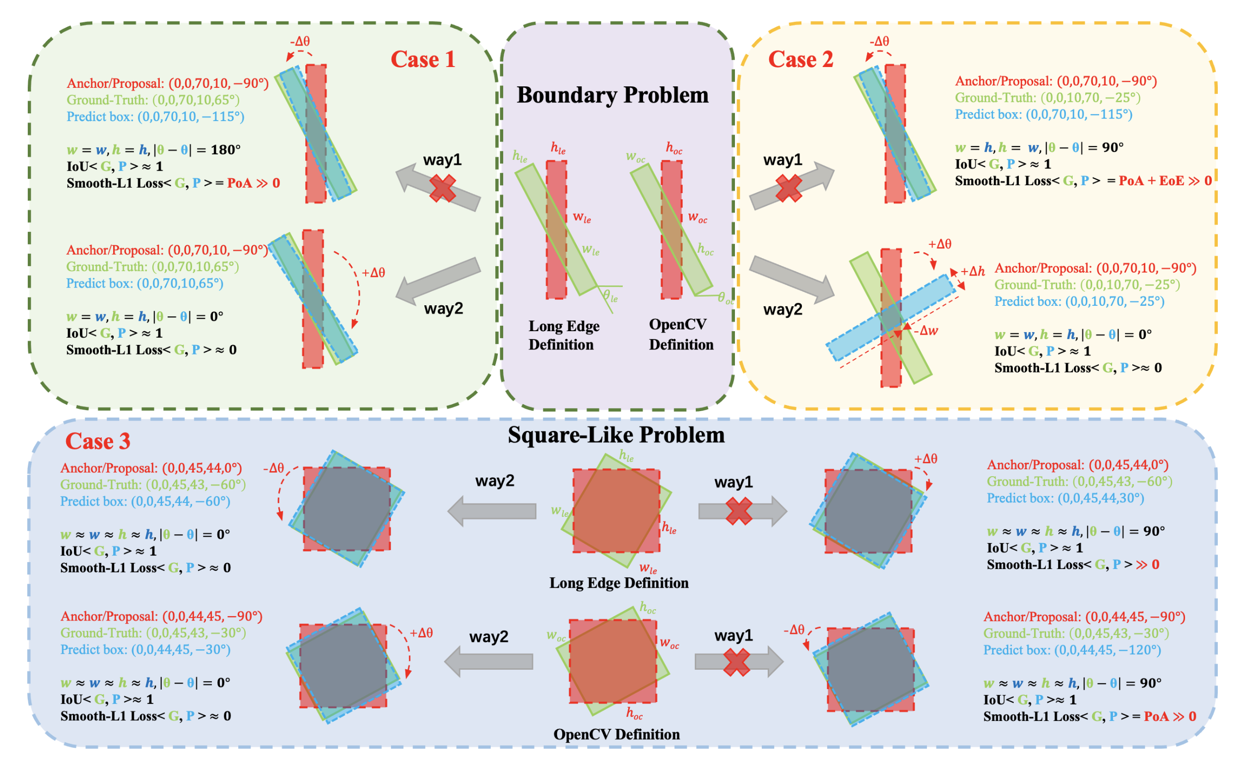 因此在设计旋转检测器过程中,表示法的作用应该局限于给初始候选框(如anchor)一个初始的表示形式,不能参与回归损失的计算,否则不同表示法和边界问题都会对检测器的优化带来影响,即回归损失应该是表示方式无关和边界问题免疫的。