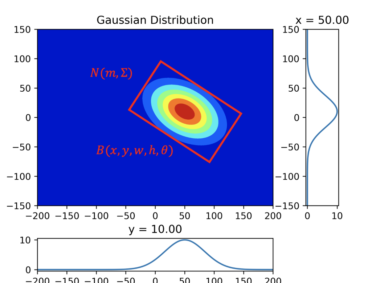 如果仅关注误差方差和性能的话,我们可以发现误差方差越小,性能趋向于越好。这一个发现也很好佐证了我们上面的发现:保证 trend-level consistency 而不需要 value-level consistency。吸取了 GWD 和 KLD 在近似 SkewIoU 路上的经验教训,此次我们依然采用高斯建模的方式,但不再通过分布距离度量来构建新的损失函数而是想通过高斯分布模拟 SkewIoU 的计算过程,具体步骤如下图: