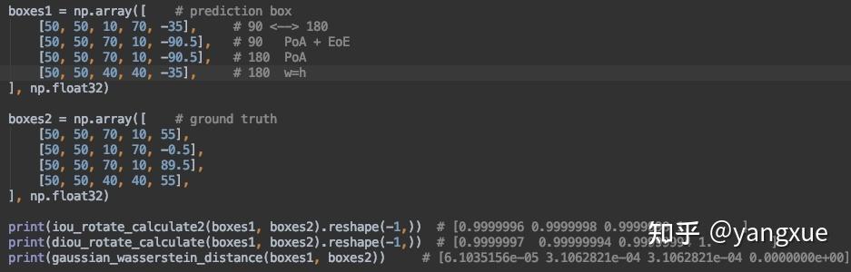 如果再思考得深入一点,我们发现对于不同的表示方式,它们计算IoU的代码其实都是通用的。这是为什么呢?因为IoU的计算过程是和第2节讲的旋转变换有关。在框的旋转过程中我们是不需要考虑旋转角度是怎么定义的,也就不需要担心变换之后是否超过定义范围,逆时针旋转5度对应的就是原始角度减去5度。检测器的参数回归也是这么做的,即使在解码中出现了我们所说的边界问题,其本质还是一个正常的旋转变换。边界问题是针对某一个确定的表示法来说的,因此如果使用IoU损失这种不用考虑框表示方式的损失函数来优化检测器就能完全不用在意边界问题。相同的,高斯建模中的协方差$\varSigma $也存在旋转变换,基于它的回归损失同样不需要考虑定义方式和边界问题。我暂将这种回归损失称为表示方式无关和边界问题免疫。