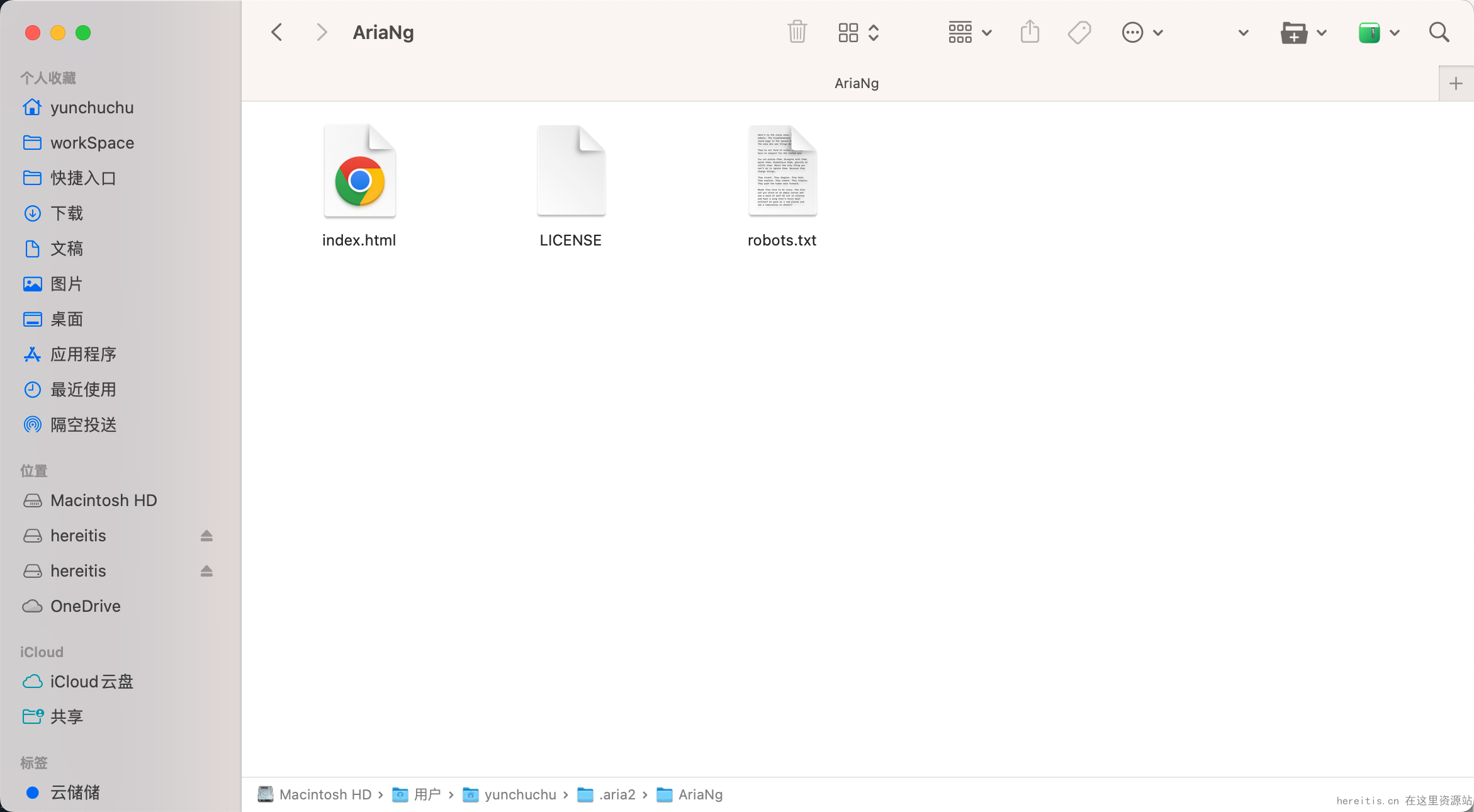 我们下载好扩展包后,解压得到一个 .aria2 的隐藏文件夹,我们可以将此文件夹放到本机账户的文件夹下,例如: /Users/chuchu/,windows 用户可以放到 c 盘用户目录下均可