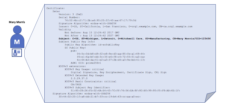 比如Mary Morris符合X.509规范的数字证书里,其Subject属性里就含有她的信息,包括国家C=US、所属的州或者省份ST=Michigan、所在城市L=Detroit、所属单位O=Mitchesll Cars、其他信息OU=Manufacturing、公用信息CN=Mary Morris/UID=123456等,也含有其他信息,如下面的图7所示。