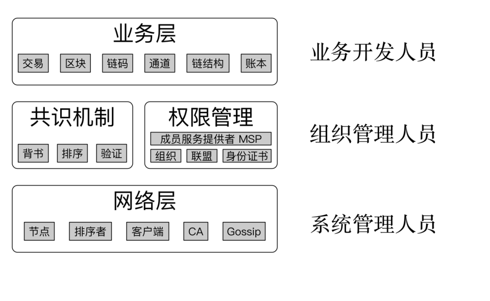 fabric联盟链的开发人员主要分为三类:底层是系统运维,负责系统的部署与维护;其次是组织管理人员,负责证书、MSP权限管理、共识机制等;最后是业务开发人员,他们负责编写chaincode、创建维护channel、执行transaction交易等,如下面的图11所示。