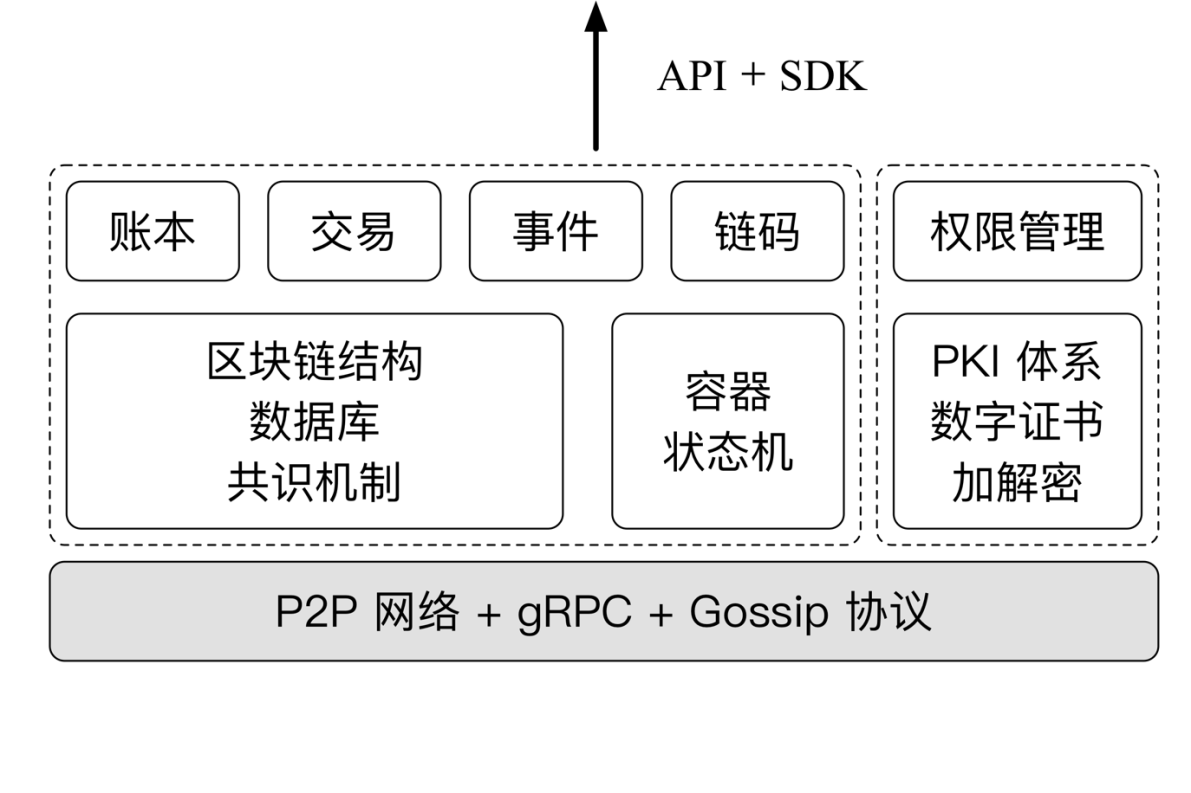 fabric大致分为底层的网络层、权限管理模块、区块链应用模块,通过SDK和CLI对应用开发者提供服务,如下面的图12所示。