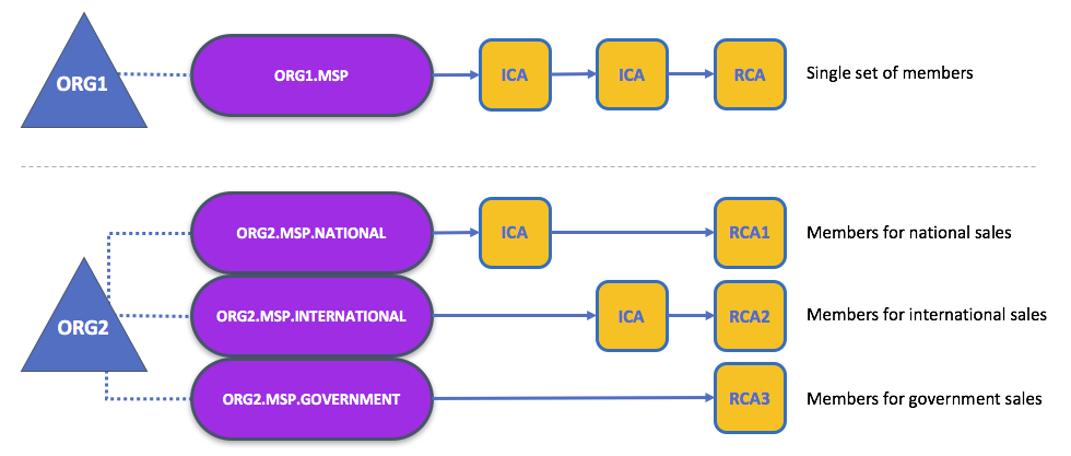 在Fabric里,允许不同的企业使用不同的RCA,也可以使用相同的RCA和不同的ICA。这与下文中的MSP密切相关。