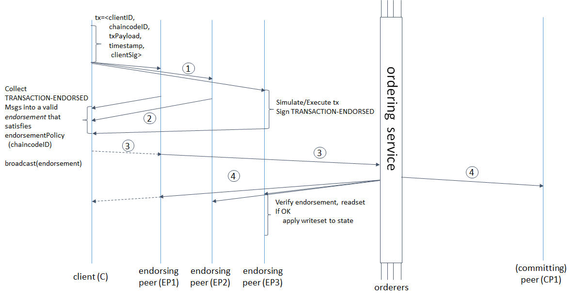 - 首先,client发起一个transaction交易,含有<clientID, chaincodeID, txPayLoad, timestamp, clientSig>等信息,指明了3W要素:消息是谁who在什么时间when发送了什么what。该消息根据chaincode中的背书策略,发向EP1、EP2、EP3这三个peer节点。
