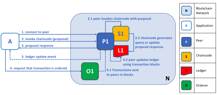 - A向O1发起交易;与此同时,O1产生区块后会通知peer,而peer会更新其账本。