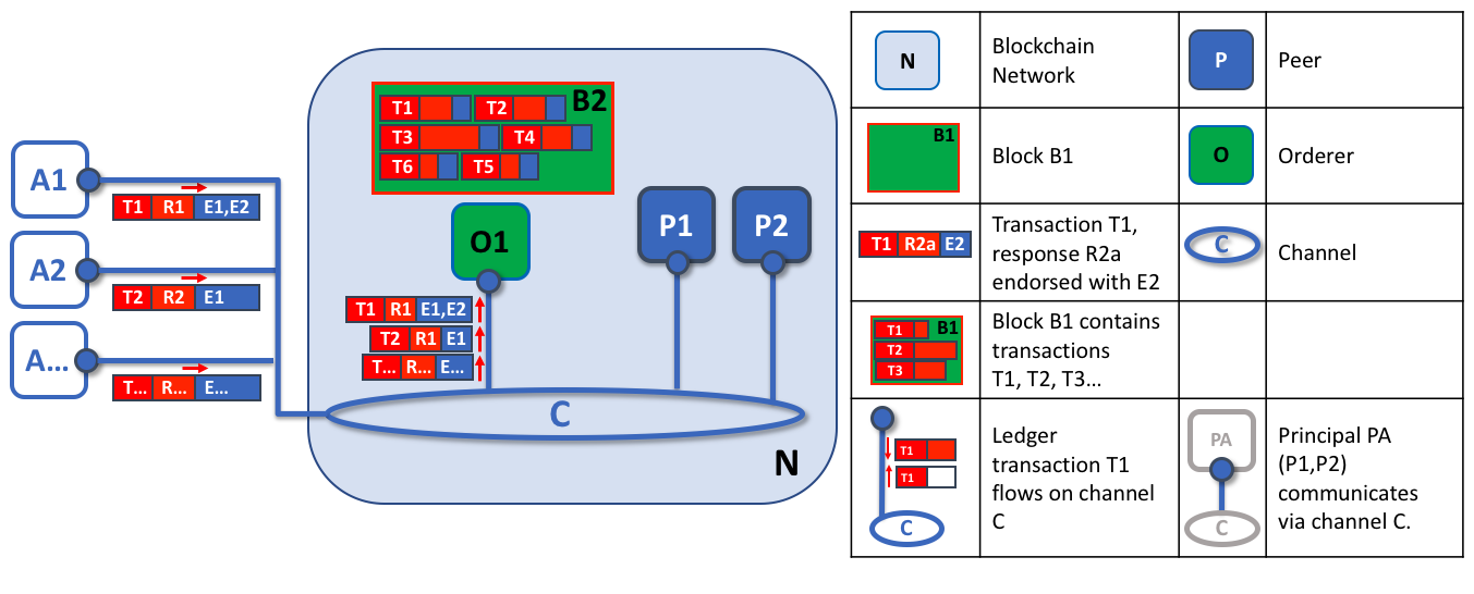 - client将获得多数同意的议案连同各peer的背书(包括其投票结果以及背书签名)交给orderring service,而orderer会汇总各client递交过来的trasaction交易,排序、打包。