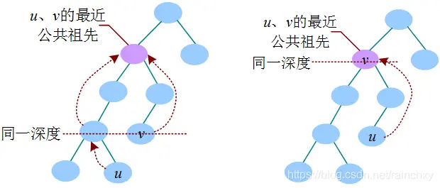 将u、v中较深的节点向上走到和深度较浅的节点同一深度,然后两个点一起向上走,直到走到同一个节点,该节点就是u、v的最近公共祖先,记作LCA(u,v)。若较深的节点u到达v的同一深度时,那个节点正好是v,则v节点为LCA(u, v)。