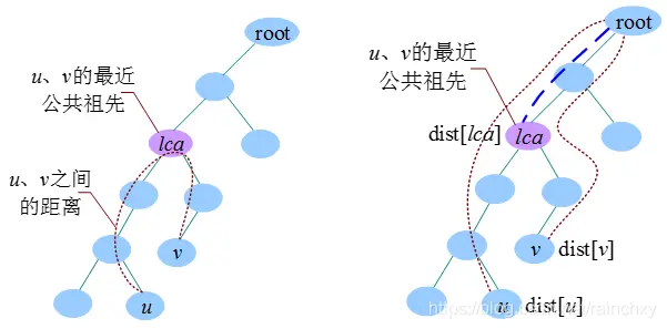 可以使用LCA求解树上任意两点之间的距离。求u和v之间的距离时,若u和v的最近公共祖先为lca,则u和v之间的距离为u到树根的距离加上v到树根的距离减去2倍的lca到树根的距离:dist[u]+dist[v]-2×dist[lca]。