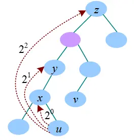 u节点向上走20步,则为u的父节点x,F[u,0]=x;向上走2^1步,到达y,F[u,1]=y;向上走2^2步,到达z,F[u,2]=z;向上走2^3步,节点不存在,令F[u,3]=0。