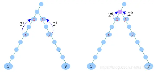 (4)减少增量,x、y同时向上走2^0步,此时到达的节点相同,什么也不做。