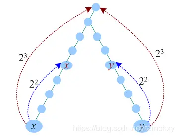 和前面暴力搜索中的同步前进法一样,先让深度大的节点y向上走到与x同一深度,然后x、y一起向上走。和暴力搜索不同的是,向上走是按照倍增思想走的,不是一步一步向上走的,因此速度较快。