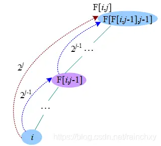 for(int i=1;i<=n;i++)//i先走2^(j-1)步到达F[i][j-1],再走2^(j-1)步