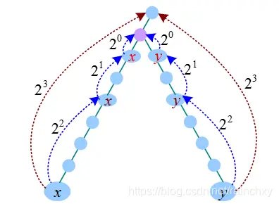 (1)x、y同时向上走2^3步,到达的节点相同,什么也不做。