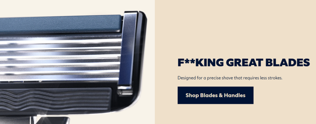 Dollar Shave Club 的营销内容以幽默风趣的方式吸引了年轻的男性消费者,打造了一个与众不同的品牌形象。DSC 的创始人迈克尔·杜宾 (Michael Dubin) 本身就是一个喜剧演员,他在品牌的视频、广告和社交媒体上展现了他的幽默感和创造力。DSC 的第一支视频广告《我们的刀片太TM好了》(Our Blades Are F***ing Great) 在 YouTube 上获得了超过 2600 万次的观看,成为了一次病毒式的营销成功。这支视频以一美元的剃须刀为卖点,用夸张和讽刺的手法展示了 DSC 的产品和服务,同时也反映了 DSC 对传统剃须刀品牌的挑战和嘲讽。而这句“太TM好”也成为了Dollar Shave Club的专属营销口号,在今天的DSC网站上还能看到这一标语。