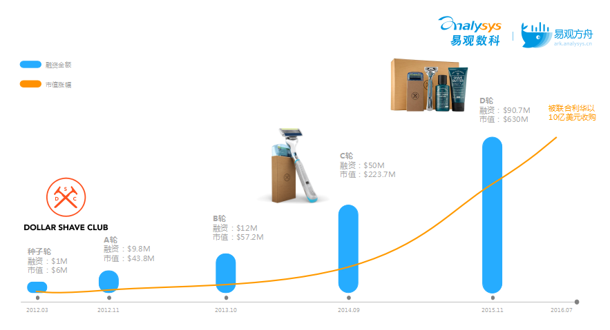 许多分析报告都惊叹于Dollar Shape Club的爆发式增长。2012年,Dollar Shave Club成立。不到一年,销售额就已经达到了400万美元。2012年11月,完成A轮融资,融资9.8M,市值43.8M;2013年10月,完成B轮融资,融资12M,市值57.2M;2014年9月,完成C轮融资,融资50M,市值223.7M;2015年11月,完成D轮融资,融资90.7M,市值630M;2016年,DSC成为了这个市场的老大,市场份额达到51%,吉列在男士剃须刀的占有率降到21.2%。正是在这一年,DSC被联合利华以10亿美元收购。