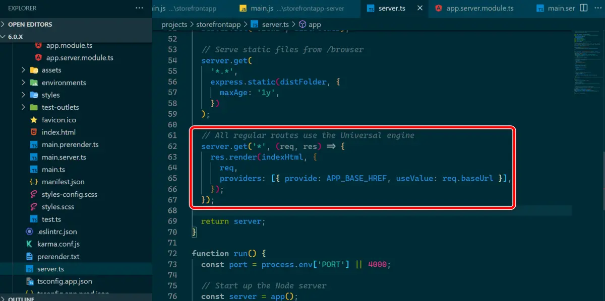 其中下图第 62 行高亮的代码块,就是 Angular Universal 引擎在服务器端渲染 HTML 页面的入口和核心。
