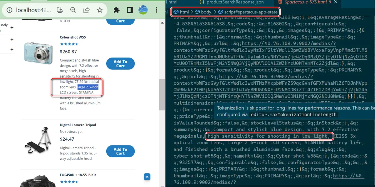 我们随便在 UI 上找一些产品业务数据,都可以在 spartacus-app-state 这个 script 元素里找到对应的 State 数据。下图是一个例子: