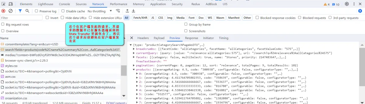 尽管产品 Category 页面从服务器端返回的结果,从上图9能看出,已经在 spartacus-app-state 这个 script 元素里,包含了所有的产品业务数据,但是当 Angular 应用在客户端 bootstrap 并重新渲染时,我们仍然能够在 Chrome 开发者工具的 Network 面板里,观察到一个重复的 product search API 请求: