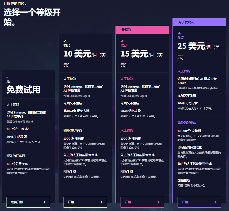 进入官网,在首页最底端可以看到月费套餐,免费套餐没有AI作画功能。10美元套餐每月有1000代币,25美元套餐每月有10000代币,使用AI作画的过程中将消耗一定数量的代币,代币用完可以花钱买代币(如3.79美元买2000代币)。