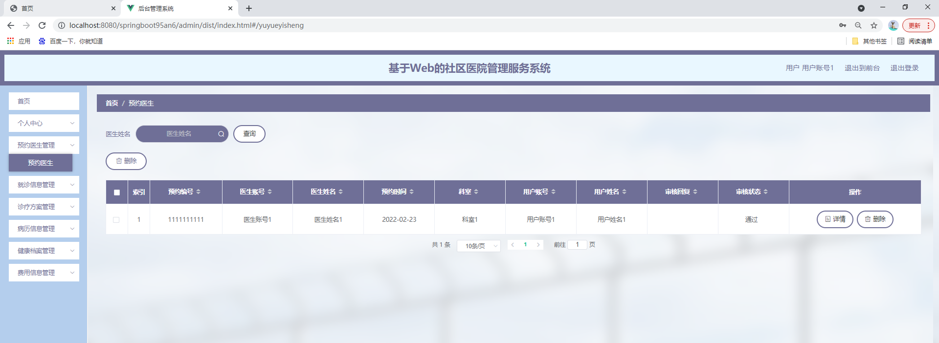在Internet高速发展的今天,我们生活的各个领域都涉及到计算机的应用,其中包括社区医院管理服务系统的网络应用,在外国线上管理系统已经是很普遍的方式,不过国内的管理系统可能还处于起步阶段。社区医院管理服务系统具有社区医院信息管理功能的选择。社区医院管理服务系统采用java技术,基于springboot框架,mysql数据库进行开发,实现了首页、个人中心、用户管理、医生管理、预约医生管理、就诊信息管理、诊疗方案管理、病历信息管理、健康档案管理、费用信息管理、系统管理等内容进行管理,本系统具有良好的兼容性和适应性,为用户提供更多的社区医院管理服务信息,也提供了良好的平台,从而提高系统的核心竞争力。