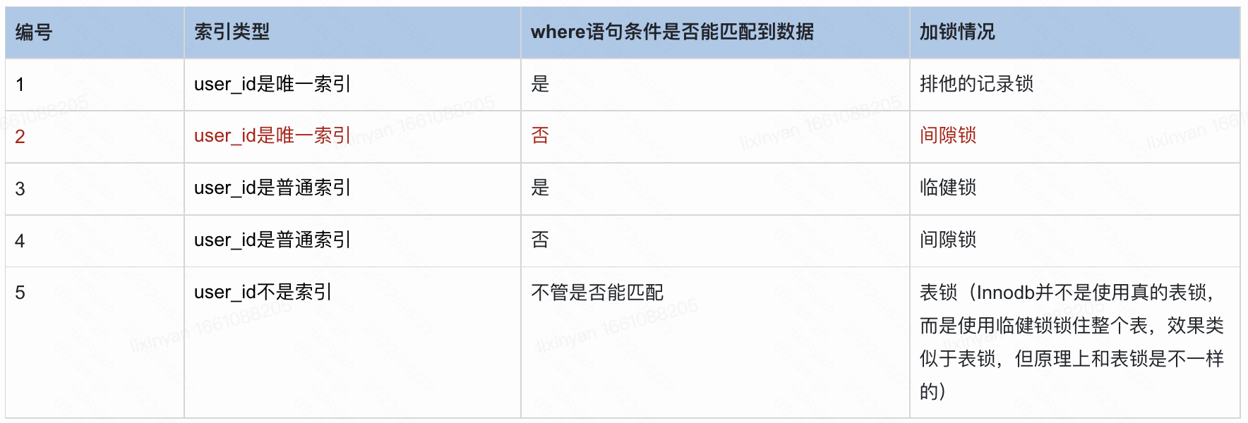 - 锁是加在索引上而非数据行上,会阻塞其他事务对该行索引的插入、更新、删除操作