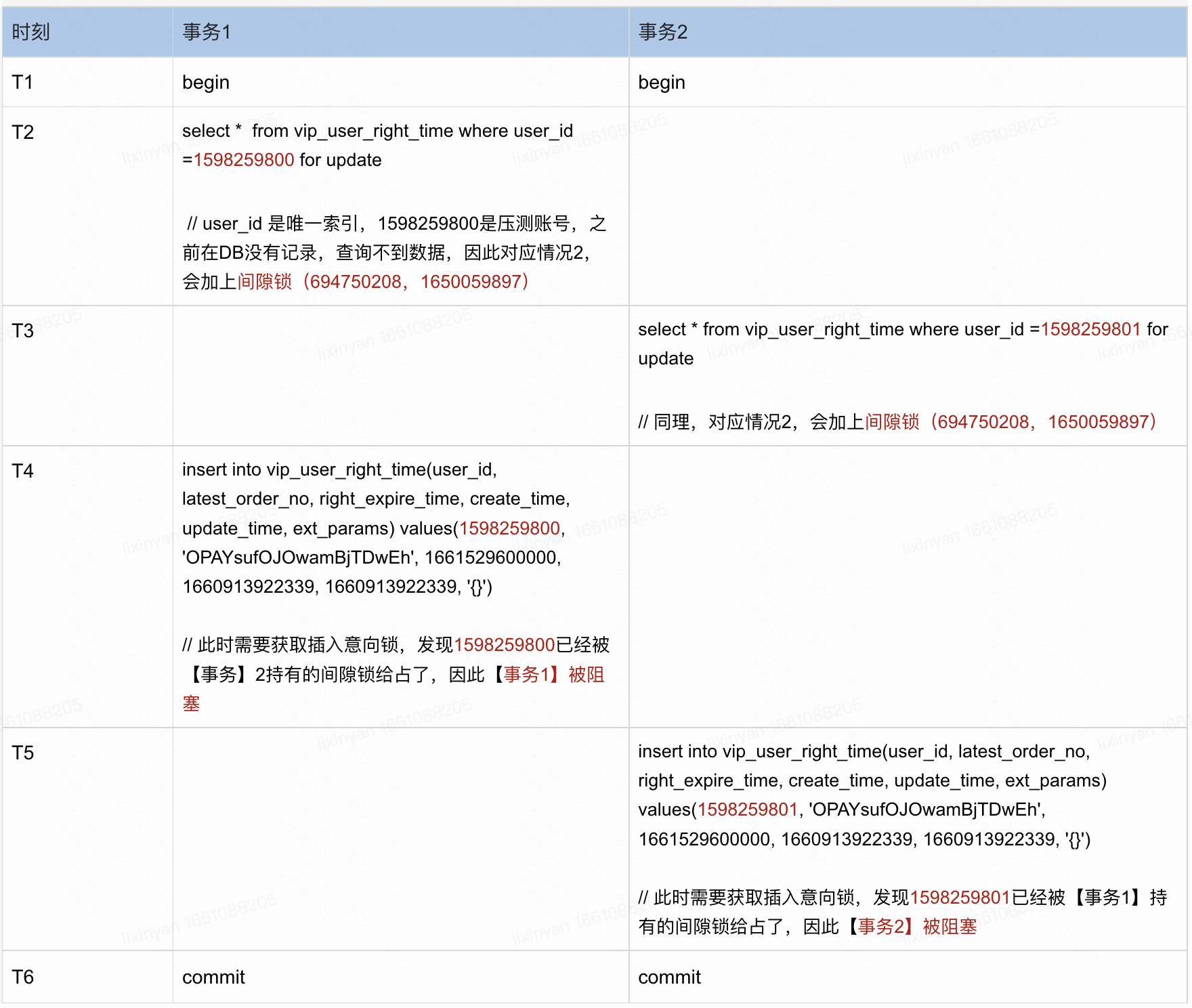 - user_id是唯一索引,1598259800是压测账号,之前在DB没有记录,查询不到数据,因此【事务1】在T2时刻会加上间隙锁(694750208,1650059897)