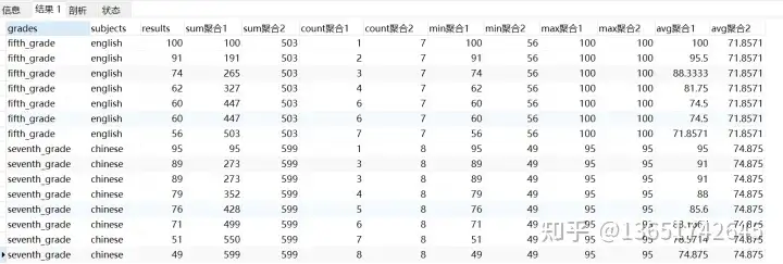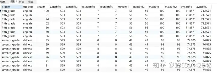 select grades ,subjects ,results ,sum(results) over(partition by grades,subjects order by results desc rows between unbounded preceding and unbounded following) as sum聚合1 ,sum(results) over(partition by grades,subjects) as sum聚合2 ,count(results) over(partition by grades,subjects order by results desc rows between unbounded preceding and unbounded following) as count聚合1 ,count(results) over(partition by grades,subjects) as count聚合2 ,min(results) over(partition by grades,subjects order by results desc rows between unbounded preceding and unbounded following) as min聚合1 ,min(results) over(partition by grades,subjects) as min聚合2 ,max(results) over(partition by grades,subjects order by results desc rows between unbounded preceding and unbounded following) as max聚合1 ,max(results) over(partition by grades,subjects) as max聚合2 ,avg(results) over(partition by grades,subjects order by results desc rows between unbounded preceding and unbounded following) as avg聚合1 ,avg(results) over(partition by grades,subjects) as avg聚合2 from test11