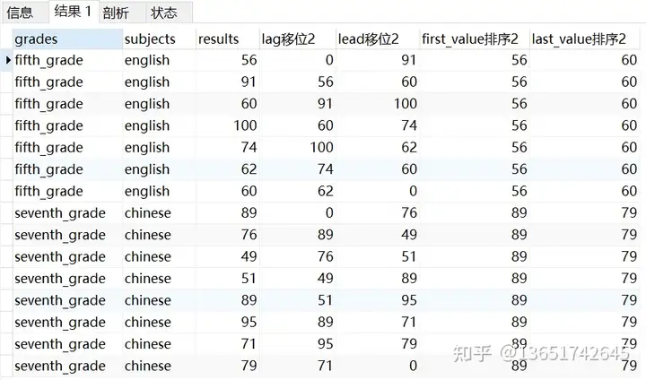 #加order by select grades ,subjects ,results ,lag(results,1,0) over(partition by grades,subjects order by results desc) as lag移位1 ,lead(results,1,0) over(partition by grades,subjects order by results desc) as lead移位1 ,first_value(results) over(partition by grades,subjects order by results desc) as first_value排序1 ,last_value(results) over(partition by grades,subjects order by results desc) as last_value排序1 from test11