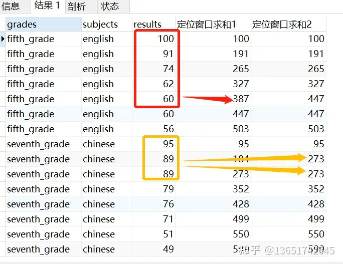 select grades ,subjects ,results ,sum(results) over(partition by grades,subjects order by results desc rows between unbounded preceding and current row) as 定位窗口求和1 ,sum(results) over(partition by grades,subjects order by results desc range between unbounded preceding and current row) as 定位窗口求和2 from test11